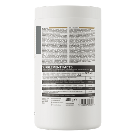 Jedna porcja to 2 miarki. W tej ilości znajduje się 10 000 mg hydrolizowanego kolagenu wołowego, 5000 mg L-glutaminy, 3000 mg monowodzianu kreatyny oraz 2000 mg L-leucyny. To bardzo konkretna porcja składników aktywnych, którą łatwo porównać z innymi produktami z tej kategorii.
