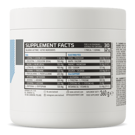 OstroVit EAAdvanced 360 g to kompleksowy suplement diety w proszku, który łączy aminokwasy egzogenne EAA, BCAA, dodatkowe aminokwasy wspierające formułę, elektrolity oraz witaminę B6. To bardzo dobry wybór dla osób aktywnych fizycznie, które chcą mieć w jednym produkcie więcej niż tylko podstawowy aminokwasowy mix. Opakowanie zawiera 360 g produktu i 30 porcji, a całość ma formę wygodnego proszku bez dodatku cukru.